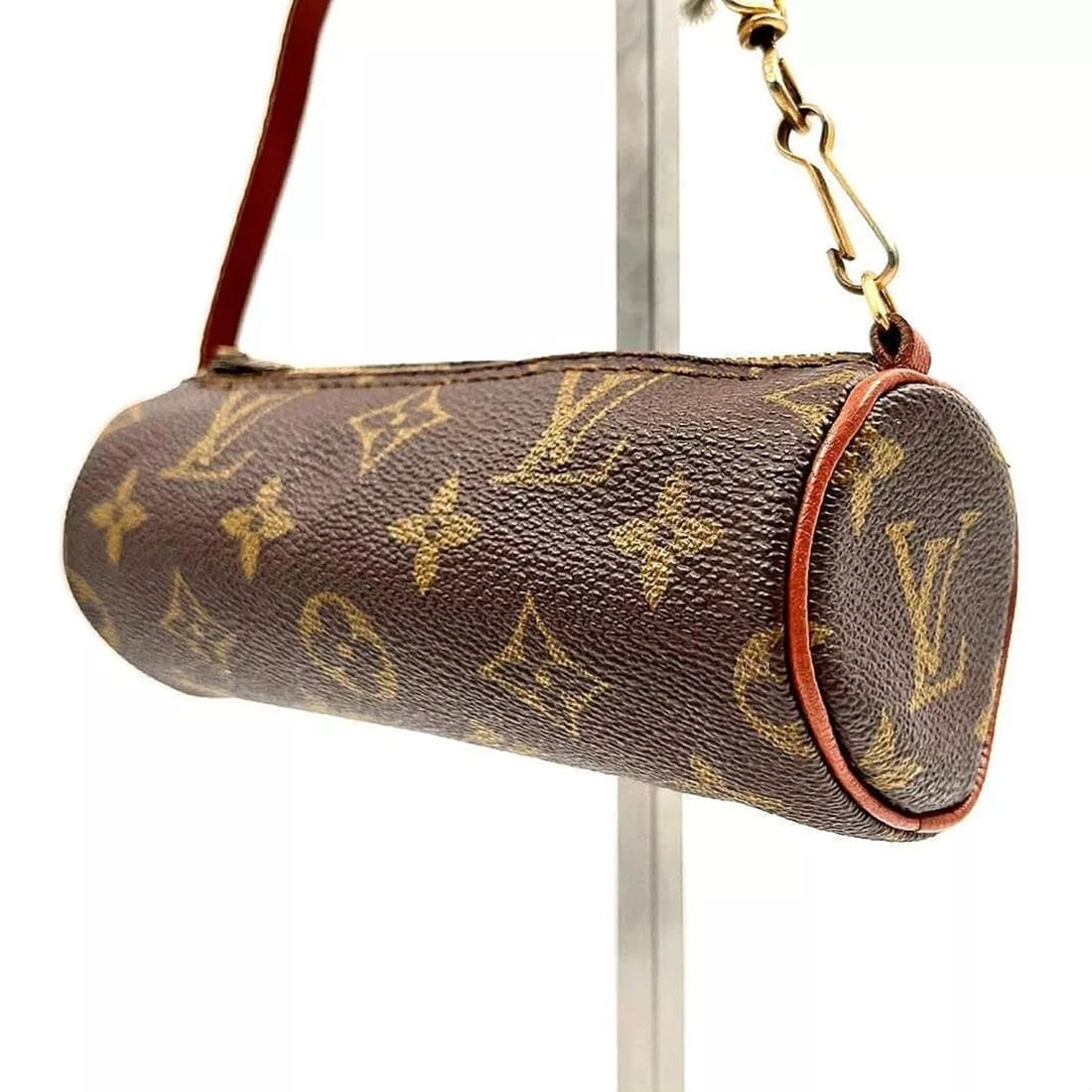 SoldVINTAGE LOUIS VUITTON MONOGRAM PAPILLON 30 AND MINI POUCHFrance, 21st century. Cylindrical bag with brown leather straps and small pouch attached with clip. 6.5"h. 12"w. 5.5"d.See Sold Price