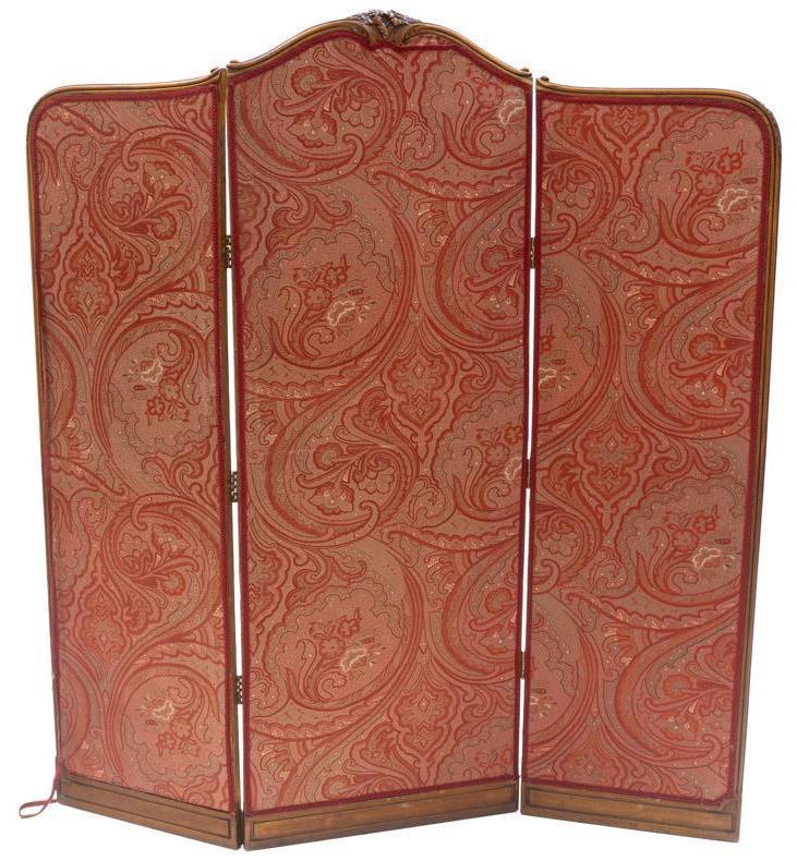 SoldFRENCH LOUIS XV STYLE SILK DAMASK DRESSING SCREENFrench Louis XV style folding screen, having three panels, with beveled glass panes, over worn silk damask accented by openwork stitching and lace, the wood frame carved with rocaille, scrollwork andSee Sold Price