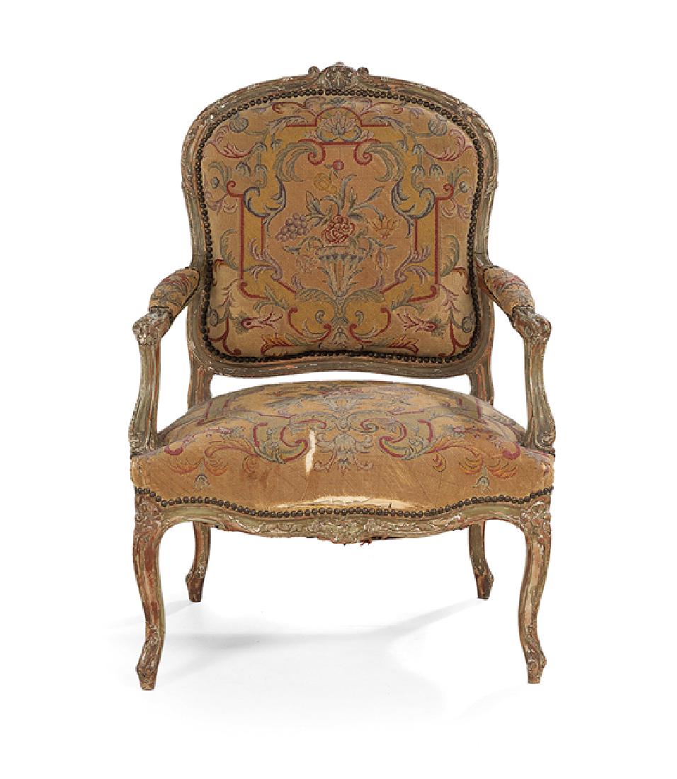 SoldLouis XV-Style Polychrome FauteuilLouis XV-Style Polychrome Fauteuil late 19th century, the padded and domed back surmounted by a floral crest and joined by padded ribbed arms to the cushioned seat, raised on cabriole legs headed by aSee Sold Price