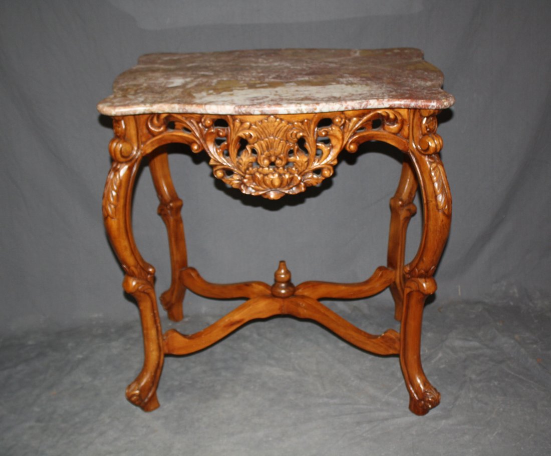 Louis XV style walnut table with turtle back marble top