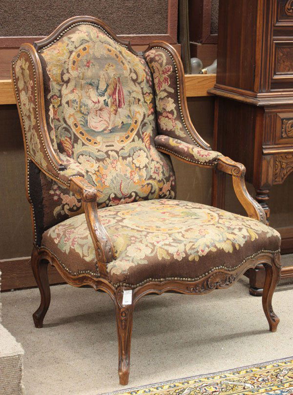 With Embroidered Upholstery by Erica Wilson (American, 1928-2011) Louis XV Style Fauteuil, USA, 20thWith Embroidered Upholstery by Erica Wilson (American, 1928-2011) Louis XV Style Fauteuil, USA, 20th century Carved and stained wood, embroidery by Erica Wilson on a white fabric groundUnmarked (H: 35