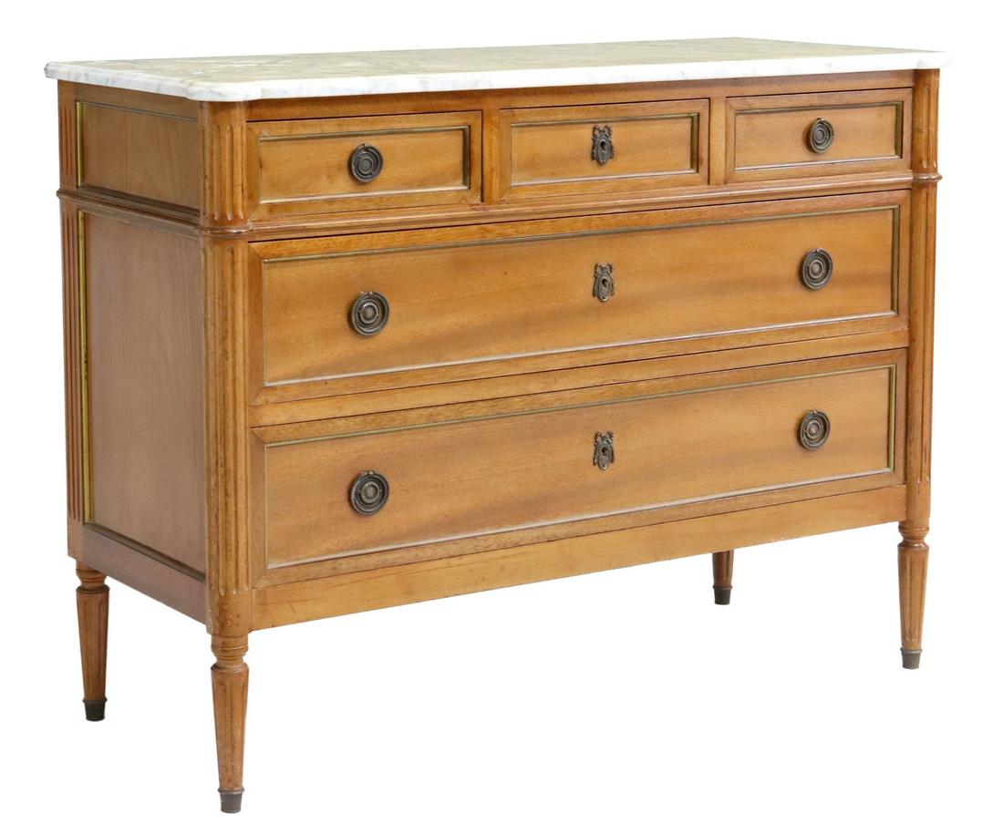 SoldFRENCH LOUIS XVI STYLE MARBLE-TOP COMMODEFrench Louis XVI style marble-top commode, late 19th c., rectangular case with fluted corner posts, fitted with three frieze drawers, over two lower drawers, rising on tapered fluted legs, approx 34"hSee Sold Price