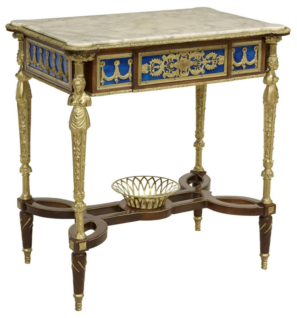 SoldLOUIS XVI STYLE ORMOLU-MOUNTED CENTER TABLE20th Century. After a design by Adam Weisweiller. The lavender and white mottled inset marble top within a gilt bronze border, the frieze with elaborate mounts all around, and fitted with a drawer, onSee Sold Price