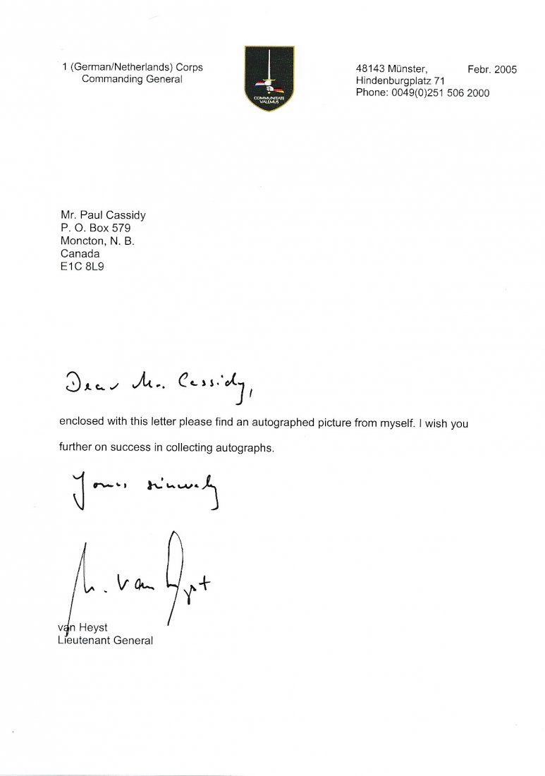 Lt. General Norbert Van Heyst- TLS Signed in 2005