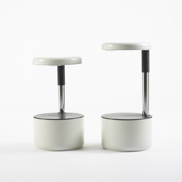 SoldROBERTO LUCCI, PAOLO ORLANDINI/ VELCAPair of adjustable "Golf" bar stools, Italy, ca. 1965; Resin, chromed steel; Marked; 13" dia.See Sold Price