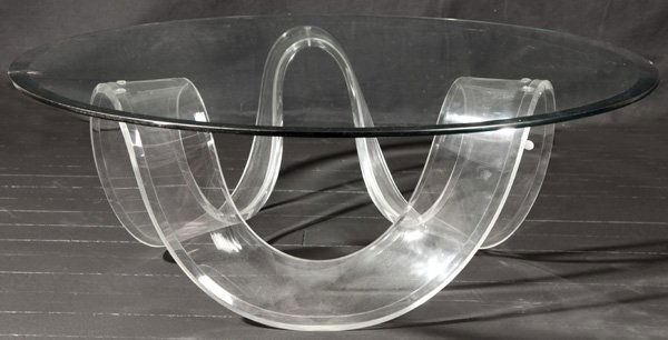 SoldLucite Ribbon Base Glass Cocktail Table. Roller CLucite Ribbon Base Glass Cocktail Table. Roller Coaster form Lucite base. Modernist 3/4" thick glass top coffee table. Slightly elliptical glass. -- Dimensions: H: 15.5 inches: W: 44 inches: D: 44 incSee Sold Price