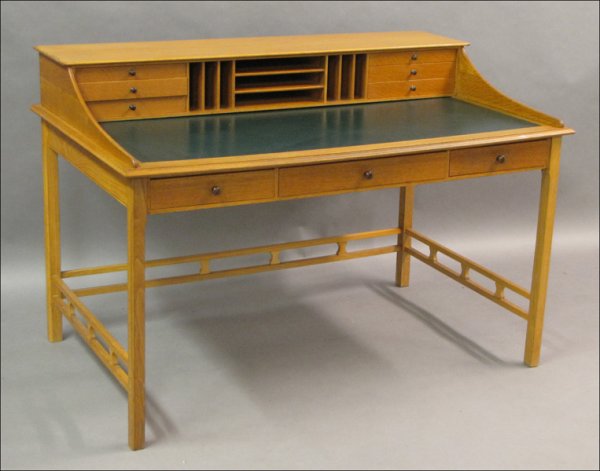 SoldMid Century Baker Maple Writing Desk with Green LeatherMid Century Baker Maple Writing Desk with Green Leather Top, Lion Head Pulls; H. 30" W. 60" D. 30"See Sold Price