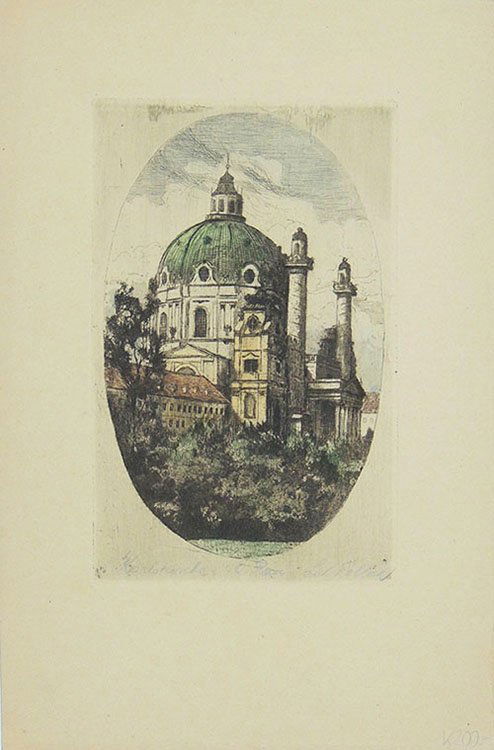 L.V. Pollack, Karlskirche, Hand colored etching, 19th