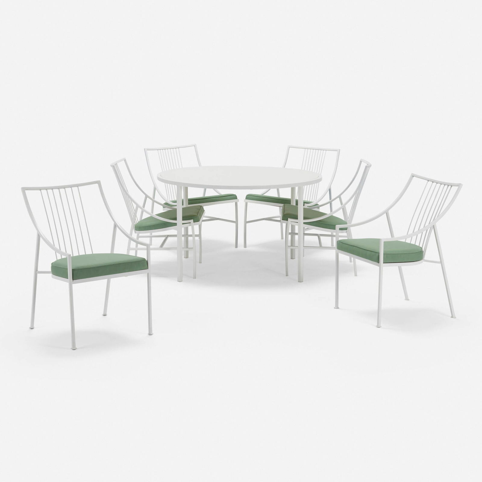 5pc RUSSELL WOODARD Outdoor Patio Dining Set. Round Iron Table with Sunburst Rays Design Top. Four S5pc RUSSELL WOODARD Outdoor Patio Dining Set. Round Iron Table with Sunburst Rays Design Top. Four Sculptural Arm Chairs. Green Paint Finish. Round Table with Top. Four Chairs with wide rolled slat ar