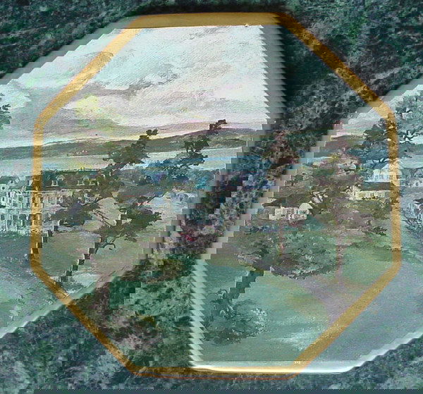 SoldVINTAGE MACKENZIE CHILDS TRAYVINTAGE octagonal paint-decorated tray with checkerboard and floral boarder centered by a landscape scene.See Sold Price