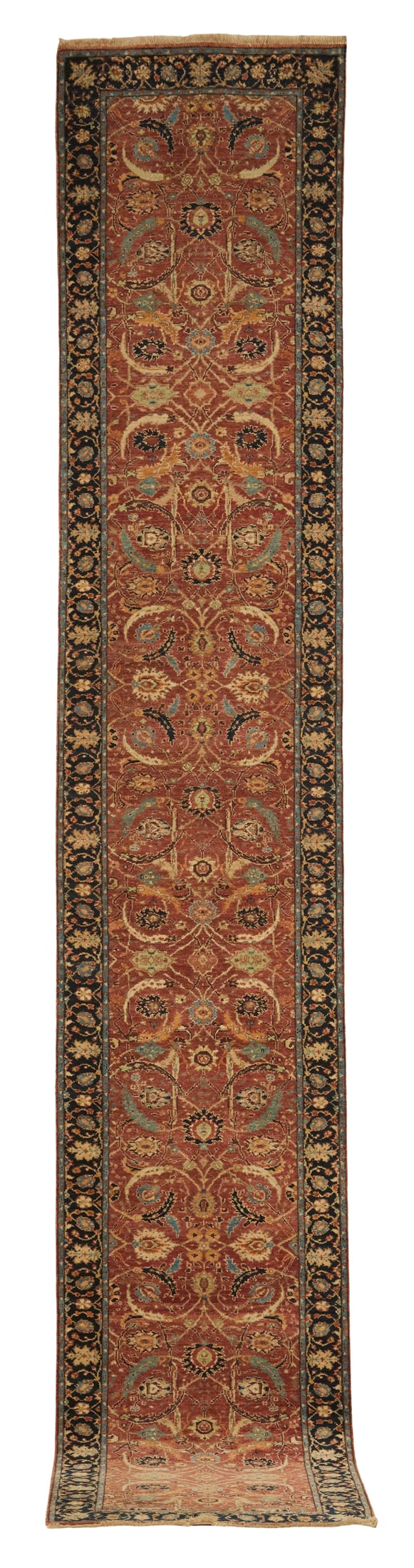 Sold2X20 Mahal Runner Hand-Knotted Veg Dye Rug2'6" x 19'6" Hand-knotted, vegetable-dyed wool pile on a cotton foundation. New Origin: India Field Color: Rust Border Color: Black Accent Color: Gold, Brown, Light-Blue, Gray, Light-Green SKU: 56.See Sold Price