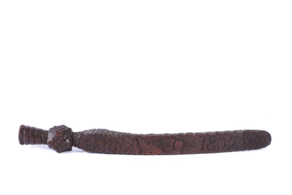 MAHOGANY CARVED WHIMSY SIGNED & DATED 1807