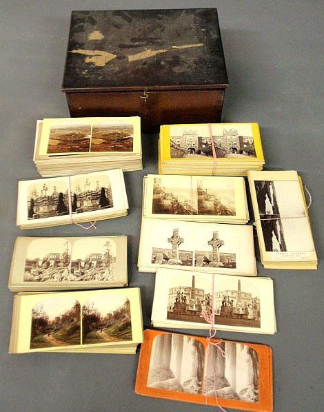 Mahogany dovetailed box containing stereo-view ca