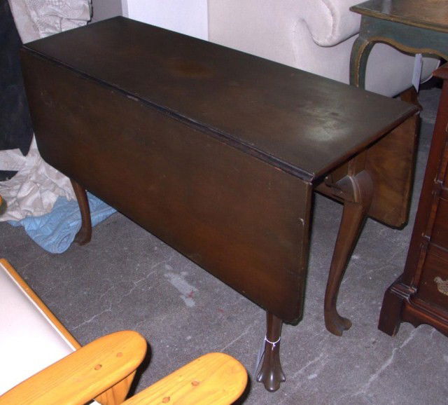 SoldMahogany Queen Anne Drop Leaf Table, poss. IrishMahogany Queen Anne drop leaf table, possibly Irish, rectangular top and two drop leaves with plain straight edges. Set on a rectangular base with shaped skirt and slightly curved Queen Anne legs withSee Sold Price