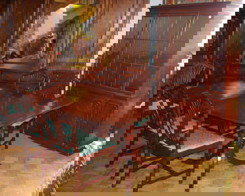 SoldANTIQUE 11 PIECE MAHOGANY DINING ROOM SETCARVED BUFFET WITH 3 DOORS & 4 DRAWERS. 63" W x 22" D x 49" H. 2 DOOR BEVELED GLASS CHINA CABINET WITH 2 GLASS SHELVES. 2 LOWER DRAWERS. 48" W x 16" D x 72" H. DRAW LEAF DINING TABLE WITH 8 CHAIRS. TASee Sold Price