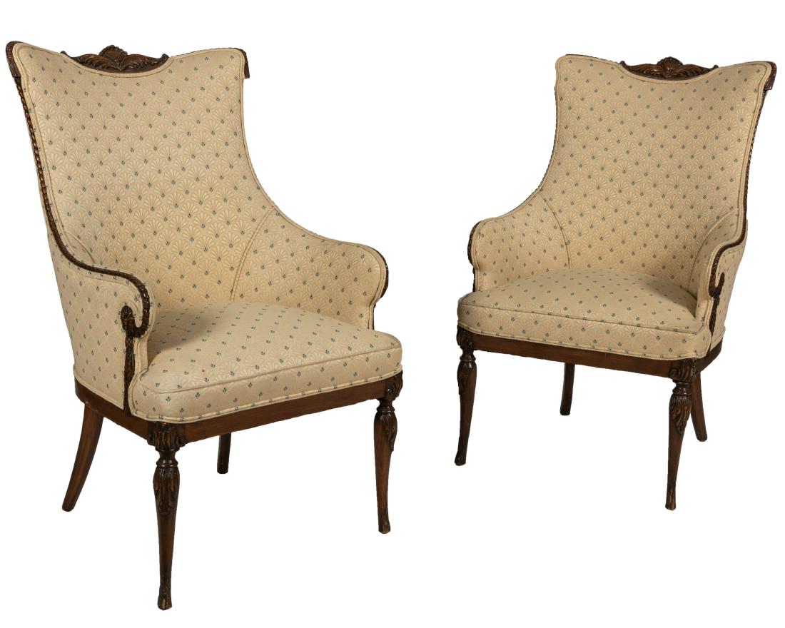 SoldPair of Regency Style Mahogany Fireside ChairsPair of Regency style mahogany fireside chairs, custom upholstery with brass tacks, molded leaf design on arms and frieze, manufacturer unknown, circa early 20th c. to mid 20th c., 41" (h) x 30" x 22"See Sold Price