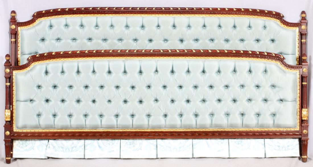 SoldMarge Carson California king size bedsteadMarge Carson Regency style mahogany California king size bedstead, having a headboard with a central foliate form finial, flanked by carved broken swan's neck pediment, and ending in fluted bedposts wSee Sold Price