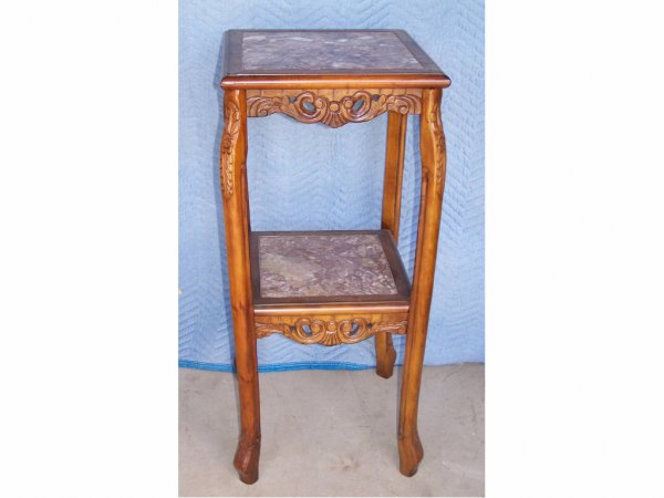 SoldChinese carved elmwood marbletop 2-tier pedestal tableChinese carved elmwood marbletop 2-tier pedestal table, inset marble top, 32"h x 16"w x 12"d, some damages to carvingsSee Sold Price