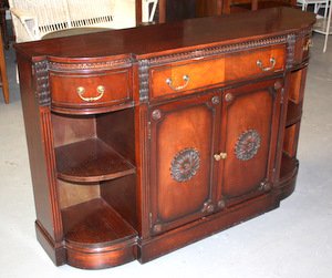 SoldMahogany George IV Bowfront ServerMahogany George IV Bowfront Server, 2 short bowfront beaded edge drawers over an open shelf over 2 short bowfront drawers, raised on turned legs, c 1820-30, 34" w, 30" h, 19" d. Generally excellent suSee Sold Price