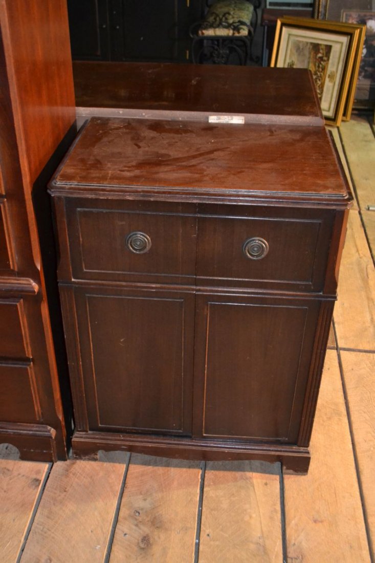 SoldMahogany Two Door Disc Record Base CabinetDivided disc record storage, pull out shelf and storage drawer. 25"w x 21"d x 37"hSee Sold Price