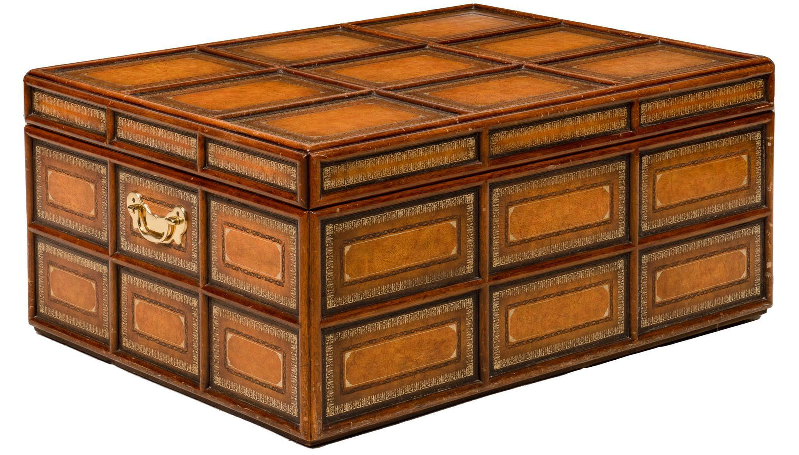 SoldLarge Maitland Smith leather and bronze trunk/coffeeLarge Maitland Smith leather and bronze trunk/coffee table, pull out writing surface on one end & pull out drawer on other, 20 1/2h x 41w x 30d (good condition, very light wear)See Sold Price