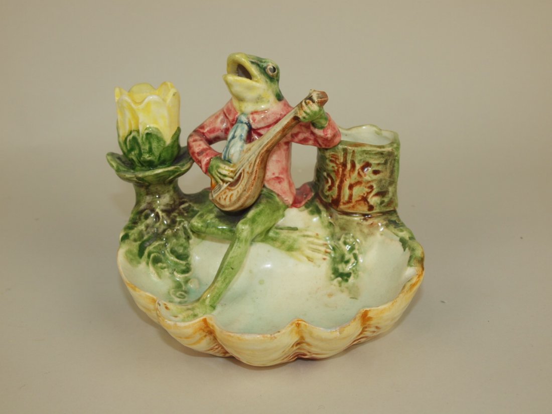 Majolica frog with mandolin on shell figural match