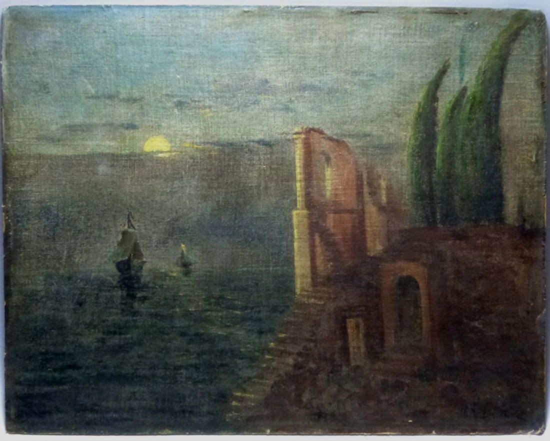 SoldAttributed to Ivan Aivazovsky Seascape PaintingAttributed to Ivan Konstantinovich Aivazovsky (Ukraine/Russia: 1817 - 1900) seascape oil painting on canvas depicting a sunset over the Turkish coast. Signed and dated to lower right. Measures: 21-1/2See Sold Price
