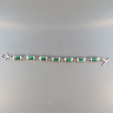 SoldMalachite and Sterling Bracelet,7 rectangular gems, 8" long, 27 grams....Malachite, with its beautiful, rich green color, leaves no doubt of its importance as a jewel. Its opaque strength and power demands respect, mesmerizing the vSee Sold Price