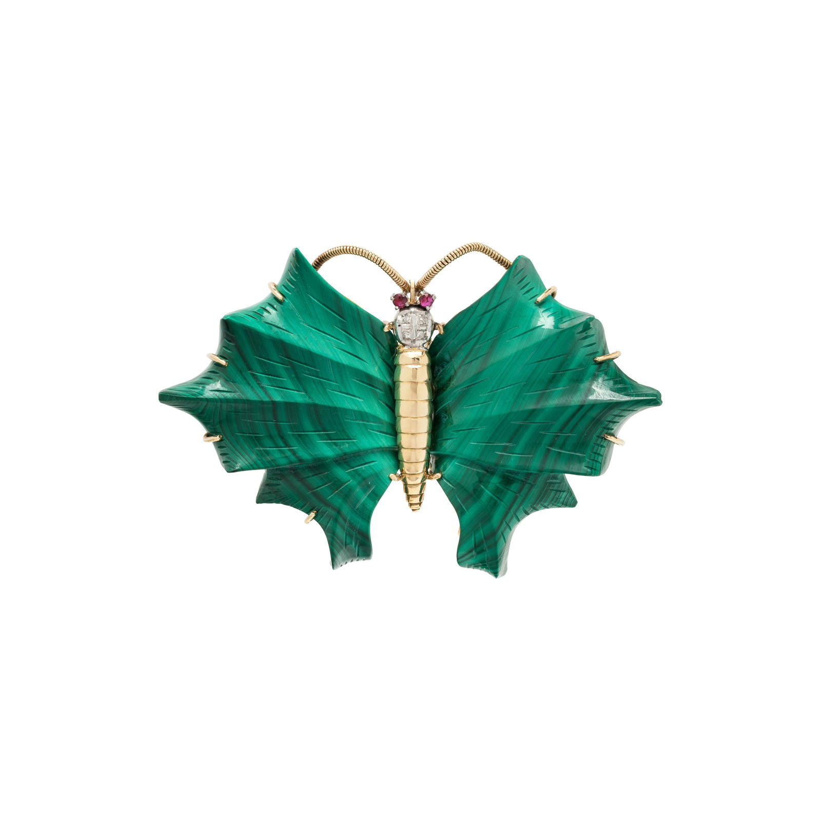 MALACHITE, DIAMOND AND RUBY BUTTERFLY BROOCH