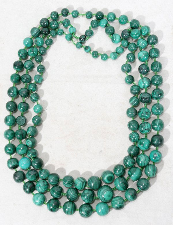 MALACHITE NECKLACES, THREE, L 30", 29",26"