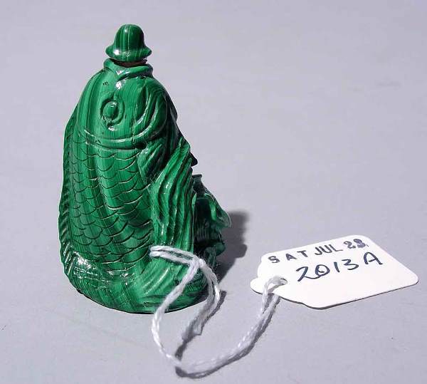 MALACHITE SNUFF BOTTLE MODELLED AS A FISH, depic