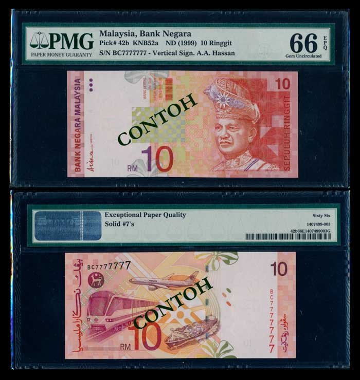 Malaysia $10 1999 solid 7s PMG Gem UNC66EPQ