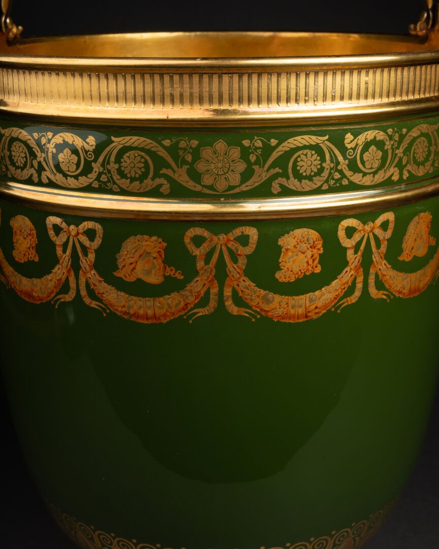 SoldManufacture de Sevres Lidded Centerpiece Bowl 1957Lidded centerpiece bowl and underplate decorated with elaborate gilt palmenttes and wreath band in empire style. Date marks for 1953 & 1957. Weight Approx., 7.6 lbs Measures Approx., Stand: 11.8 in. dSee Sold Price