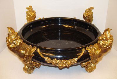 SoldHEAVY MARBLE AND GILT BRONZE ORMOLU CENTERPIECEHeavy marble and gilt bronze ormolu centerpiece, Black marble bowl decorated with four busts of beautiful bronze gilt women. Each bust separated by a row of garland. Measures approx 19" widest point xSee Sold Price