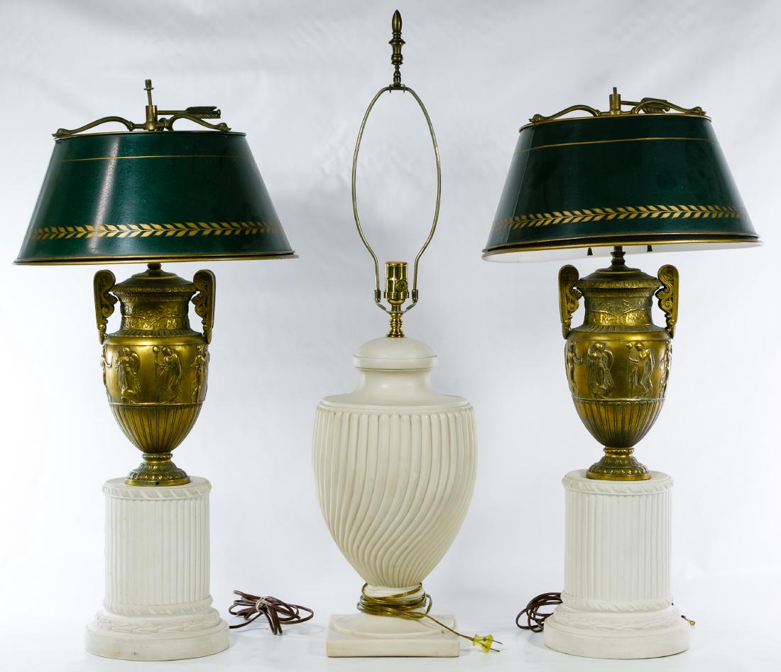Neoclassical & Regency Style Table Lamps 3pc LOT6 days Left19th Century French Gilt Bronze & Marble Clock Garniture Set with Candelabra Lamps2 days LeftPair of Malachite Table LampsMar 29, 2026French Patinated Bronze and Marble Urn LampsMar 28, 2026Italian Neoclassical, Marble, Alabaster, Brass, Table Lamps, Italy, 1940sPair of French Rock Crystal and Bronze LampsMar 29, 2026PAIR OF LOUIS XVI STYLE BRONZE & MARBLE LAMPS6 days LeftRestauration Bronze Dore et Patine Urn LampsMar 28, 2026PAIR OF VINTAGE STACKED CLEAR SPHERE TABLE LAMPS WITH TAPERED SHADES14 hrs Left(3) COLLECTION OF 1-LIGHT TABLE LAMPS, NEOCLASSICAL STYLE & OTHERSMar 28, 2026Pair of Porcelain Lamps of Chinese InspirationMar 29, 2026Pair of Bronze and Malachite Neoclassical Table Lamps with Fringe Shades2 days LeftPair of Chinese-Style Porcelain Table LampsMar 28, 2026Pair of White Ceramic Table Lamps with Antique Brass Detailing13 hrs LeftAntique Pair of Louis XVI Style Marble and Gilt Bronze Urns Table Lamps with Heads of Rams2 days LeftPAIR OF BRASS TABLE LAMPS MAISON CHARLES STYLE14 hrs Left