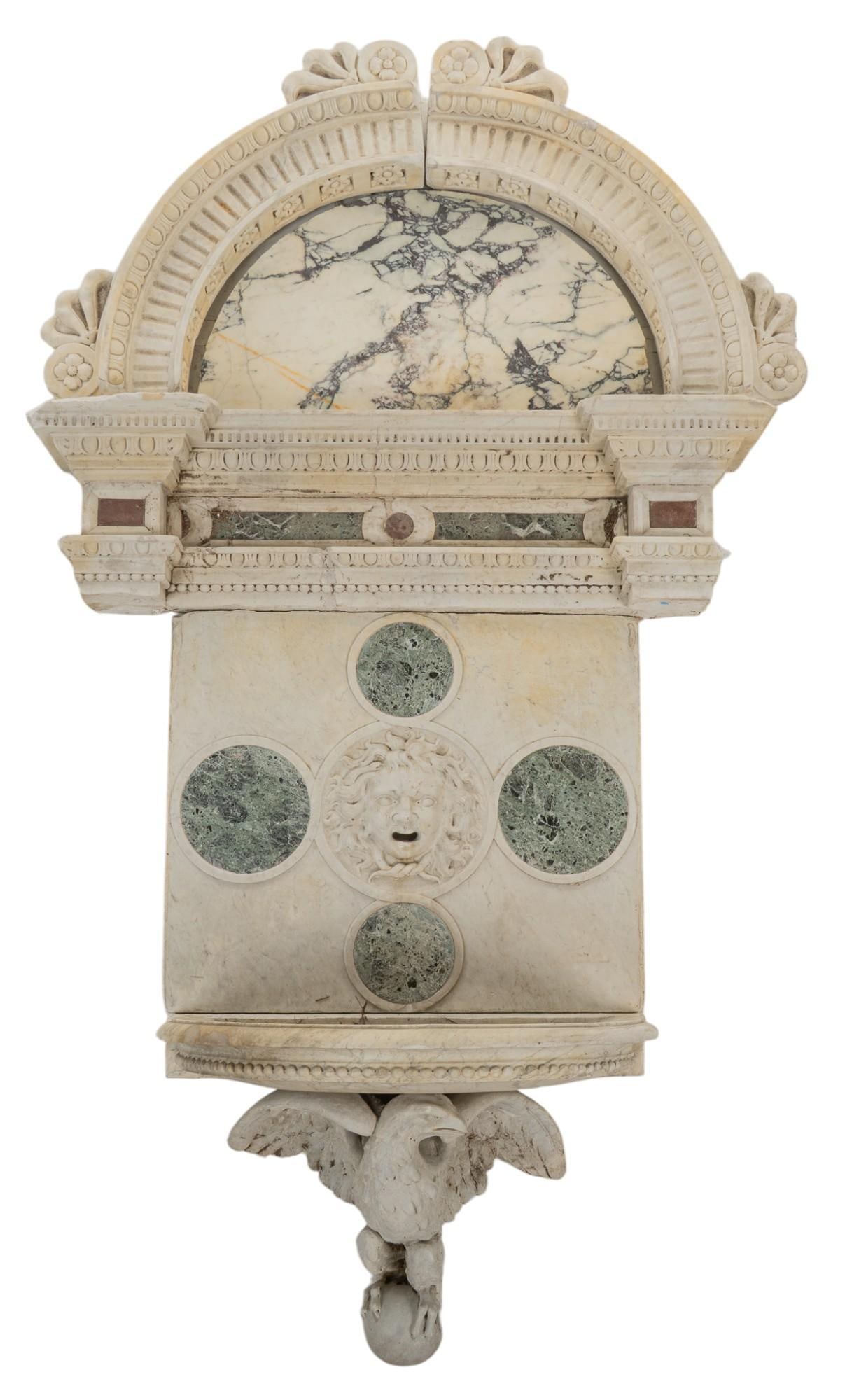 SoldMarble FountainMarble fountain featuring arched columns, green stone accents, central face motif, on eagle base Provenance: Property from the collection of a San Antonio, Texas lady height 70 in. x width 52 in. xSee Sold Price