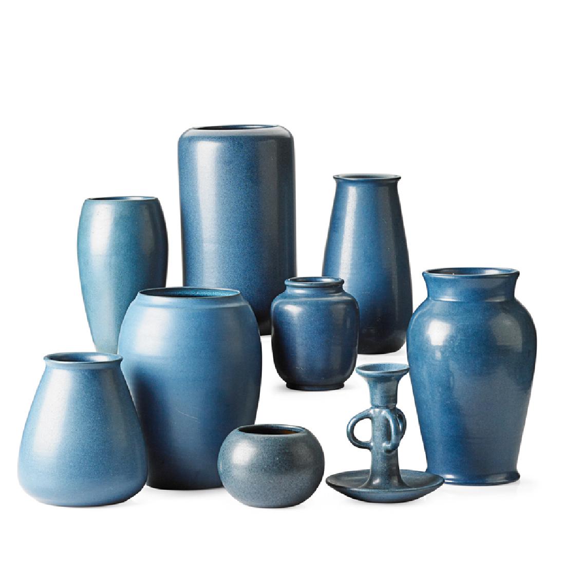 MARBLEHEAD Eight blue vases, one candlestick