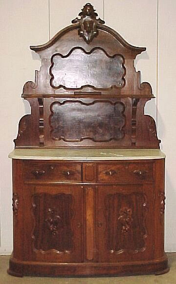 SoldWalnut Victorian marble top sideboardWalnut Victorian marble top sideboard with fruits and nuts carved in crown and burl walnut oval panels, all original, 90 in. T, 52.5 in. W, 20.5 in. D.See Sold Price