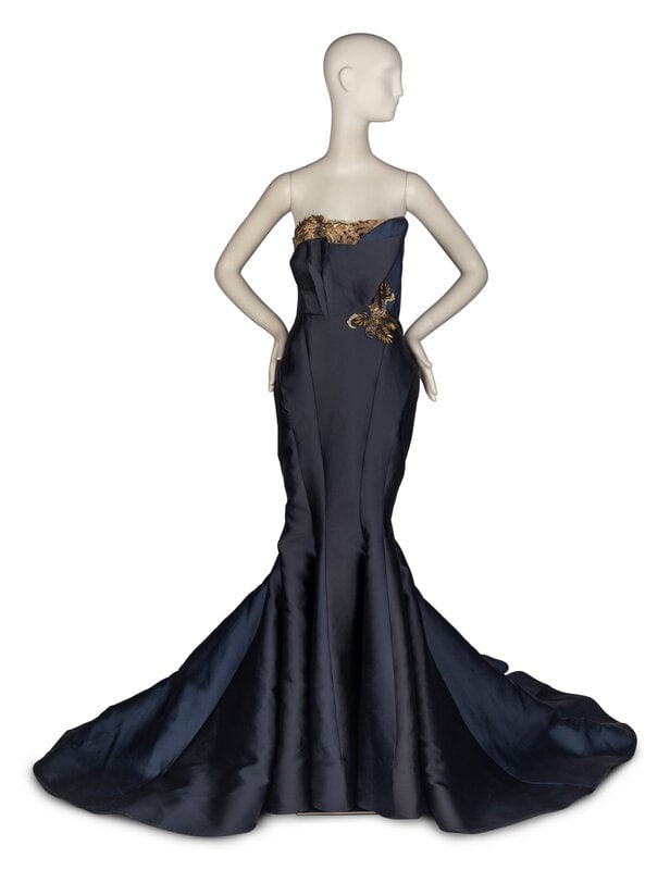 CHRISTIAN DIOR: SLATE BLUE SILK BIAS CUT BELTED LOGO GOWN Fall/Winter 2004 | John GallianoBonhams4(383)$1,800