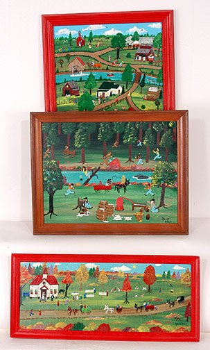 SoldThree Delores Hackenberger Rural Landscape Paintings.Three Delores Hackenberger Rural Landscape Paintings. Two farms scenes. One covered bridge. All in primitive wood frames. Largest measures 11-3/4" x 19-1/4" overall. Condition: Good with wear.See Sold Price
