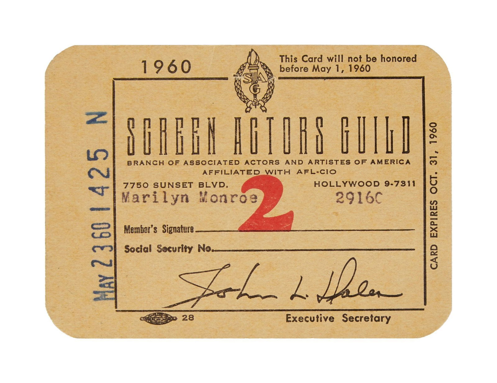 Marilyn Monroe | 1960 Screen Actors Guild Card