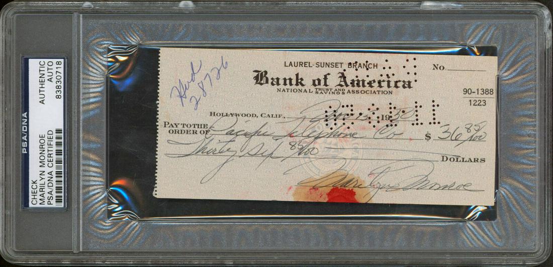 SoldGorgeous Marilyn Monroe Fully Handwritten Signed Check. PSA EncapsulatedGorgeous Marilyn Monroe Fully Handwritten Signed Check. PSA Encapsulated Marilyn Monroe Signed check, 6" x 2.75", Hollywood, California, dated January 10, 1953. Drawn on the Bank of America Laurel-SunSee Sold Price