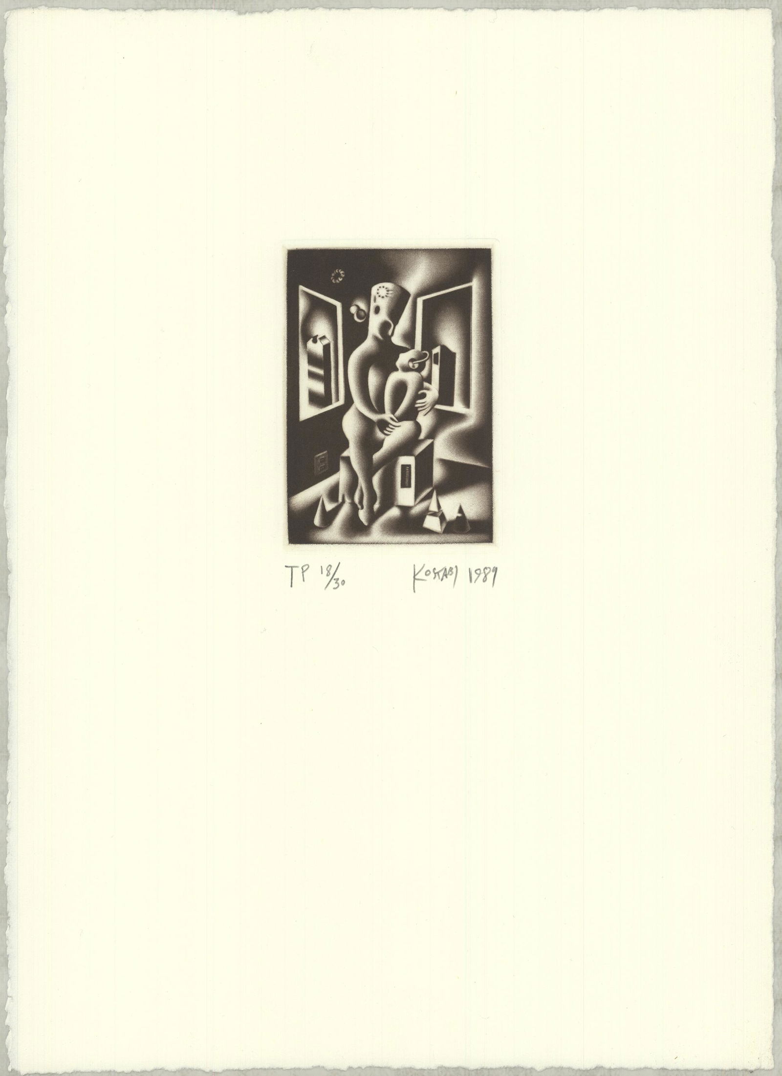 SoldMark Kostabi - Body by JakeLot 36 Mark Kostabi American (b. 1960) Body by Jake (1989) mezzotint on Rives BFK paper pencil signed lower right, numbered TP 1/12 plate: 8 1/4 x 6 inches Provenance: The Estate of Bruce TelekySee Sold Price