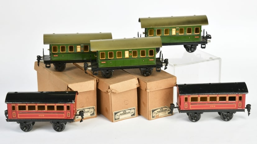 SoldMärklin Passenger Car No. 18940, Gauge 0, c. 1930Märklin Passenger Car No. 18940, Gauge 0, c. 1930 With interior, hand-painted roof, 4 axles, length 8 4/5 in. Märklin-D-Zugwagen Nr. 18940, Spur 0, um 1930 Mit Inneneinrichtung, handlackiertes DSee Sold Price