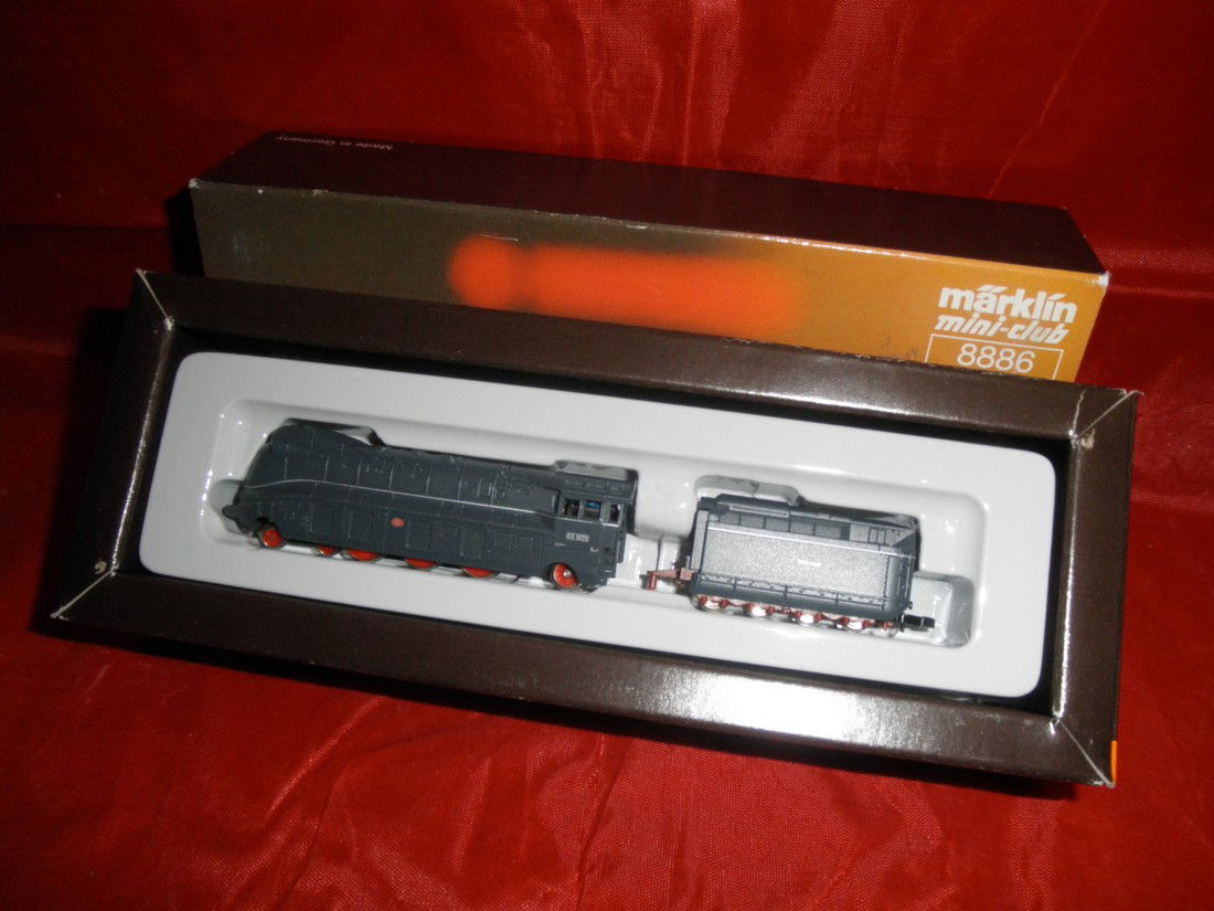 SoldMarklin Mini Club Z Scale Steam Locomotive BR 38Model no. 8893, modeled after the Deutsche Bundesbahn Class 38. It exhibits the quintessential characteristics of German steam engineering with its commanding black boiler and striking red running geaSee Sold Price