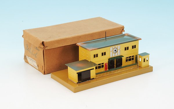 ETTORE SOTTSASS (1917-2007) Table d'appoint Primaverarailroad station, tin, '30s, base plate 48x20.5 cm, pressure marks and paint flaws on the roof,Apr 24, 2026BING railroad station, sheet metal, used condition, dusty, base plate 59 × 21 cm, 2 small towerApr 24, 2026railroad station, sheet metal, lithographed, min. paint damages, slightly dusty, otherwise good,Apr 24, 2026Marklin train station with clock tower
