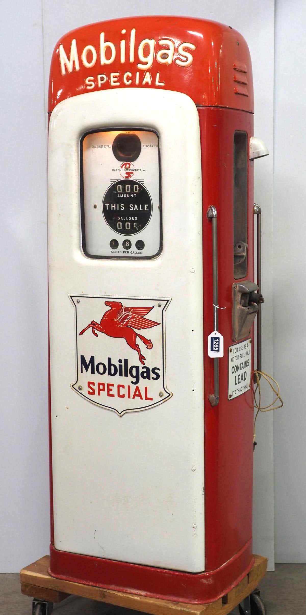 SoldMARTIN & SCHWARTZ MODEL #80 GAS PUMP WITH MOBILGAS TOPPER.Martin & Schwartz Model #80 Gas Pump showing Mobilgas Script Top. CONDITION: Pump is all original and in as found condition showing original patina paint. Pump is missing porcelain face. Pump displaysSee Sold Price
