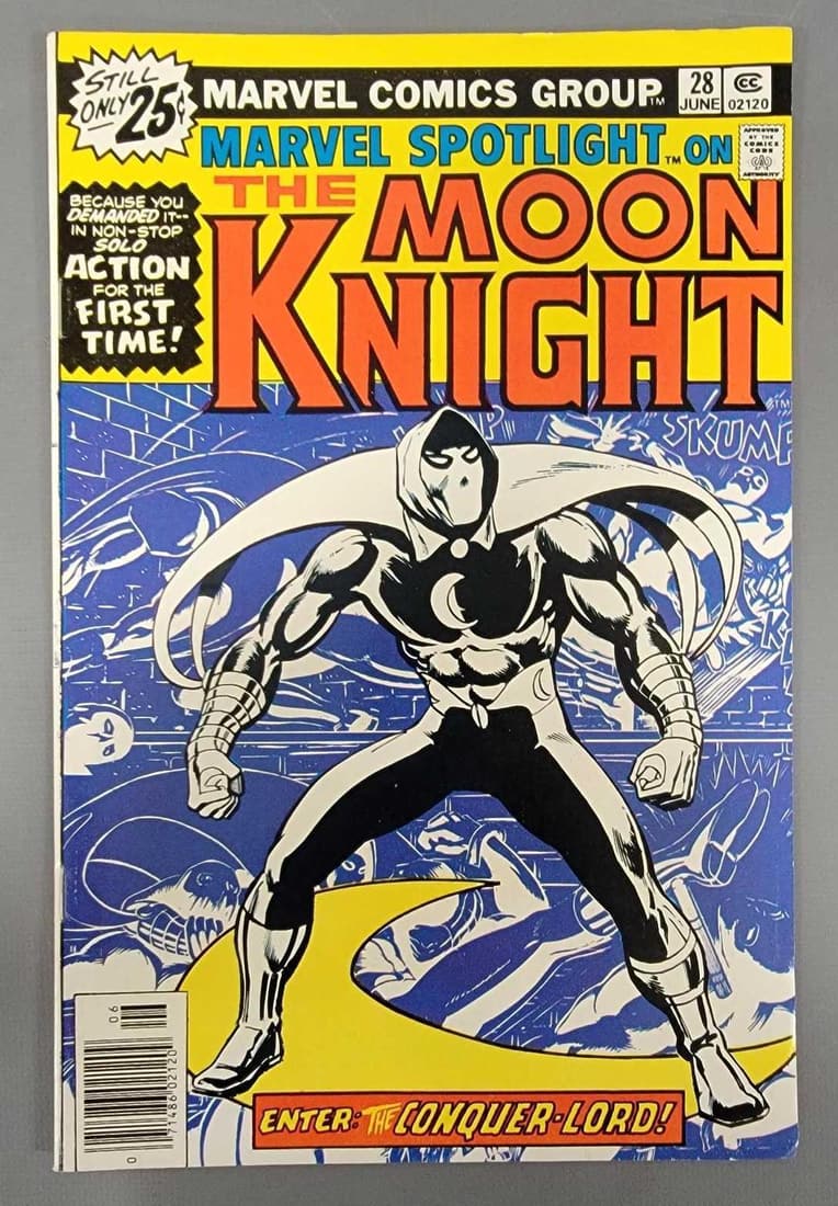 SoldMarvel Spotlight #28 & 29 1st & 2nd Solo Moon Knight story Marvel Comics June 1976Marvel Spotlight #28 & 29, published on June 10, 1976, marks Moon Knight's first solo story, solidifying his transition from a guest character to a leading hero in the Marvel Universe. Written by DougSee Sold Price