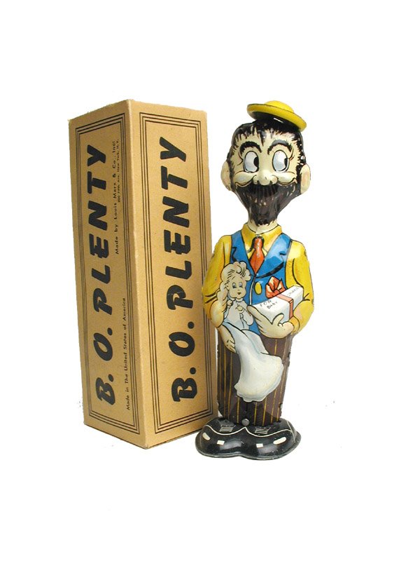 SoldMarx B.O. Plenty Wind-Up Toy.Marx B.O. Plenty Wind-Up Toy. New York: Marx Toys, 1930s. Lithographed tin figure vibrates and tips his hat when wound. Original box. Height 9”. Light scratches.See Sold Price
