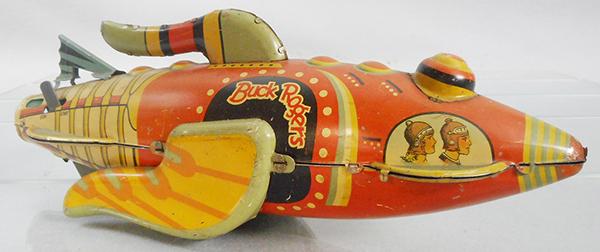 Sold1930s Marx Tin Buck Rogers Rocket Ship1930s Marx Tin Buck Rogers Rocket Ship. Original working large space ship. Wind-up mechanism is working but needs flint to spark. Rear fin probably a replacement. Marked Buck Rogers on both sides andSee Sold Price